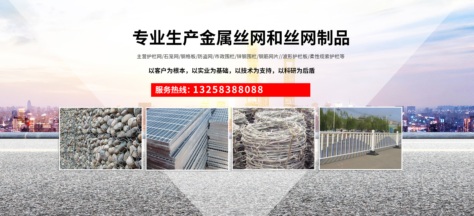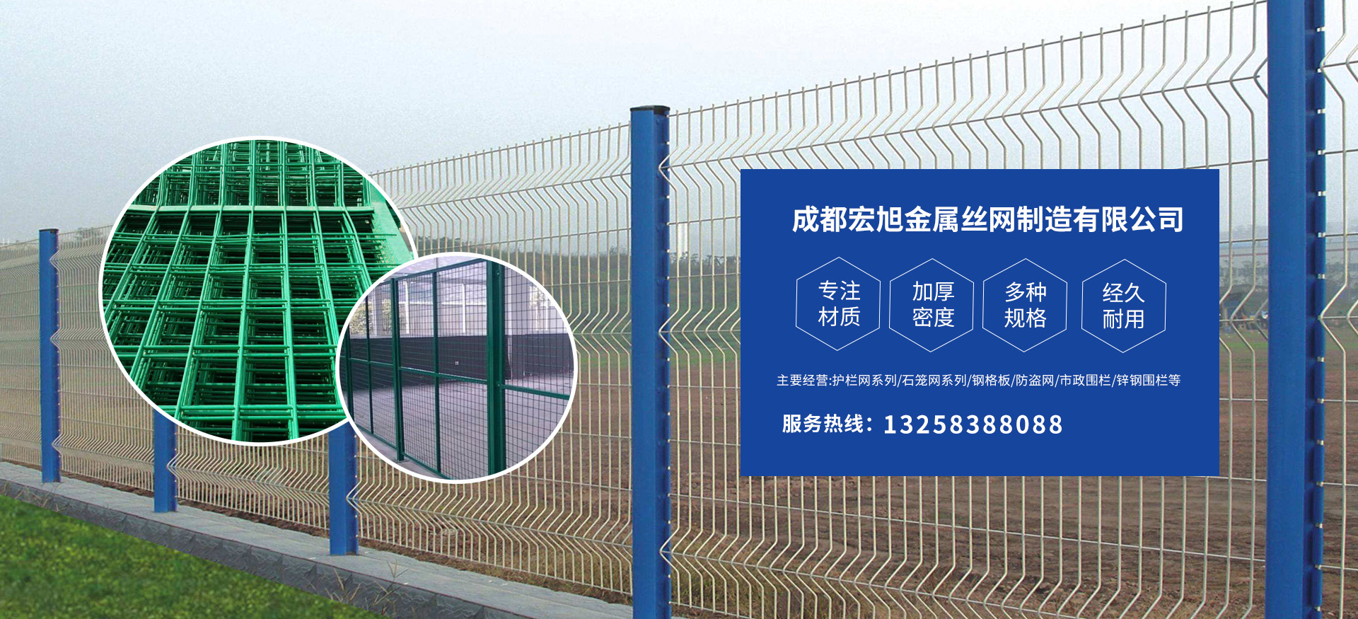 成都宏旭金屬絲網(wǎng)制造有限公司主營護欄網(wǎng)系列、石籠網(wǎng)系列、鋼格板、防盜網(wǎng)、市政圍欄、鋅鋼圍欄、鋼筋網(wǎng)片、聲屏障系列、波形護欄板、柔性纜索護欄、SNS邊坡防護網(wǎng)等其他絲網(wǎng)類產(chǎn)品。特殊規(guī)格可加工定做,也可根據(jù)客戶來圖來樣定做。自創(chuàng)業(yè)以來,公司一直堅持市場為導向,以客戶為根本,以實業(yè)為基礎(chǔ),以技術(shù)為支持,以科研為后盾,集科研、生產(chǎn)、經(jīng)營為一體,不斷研制開發(fā)新產(chǎn)品,開拓市場,走綜合發(fā)展之路。多年來,公司憑借過硬的質(zhì)量,良好的信譽、優(yōu)質(zhì)的服務(wù)、合理的價格,贏得了市場和商家的一致好評。